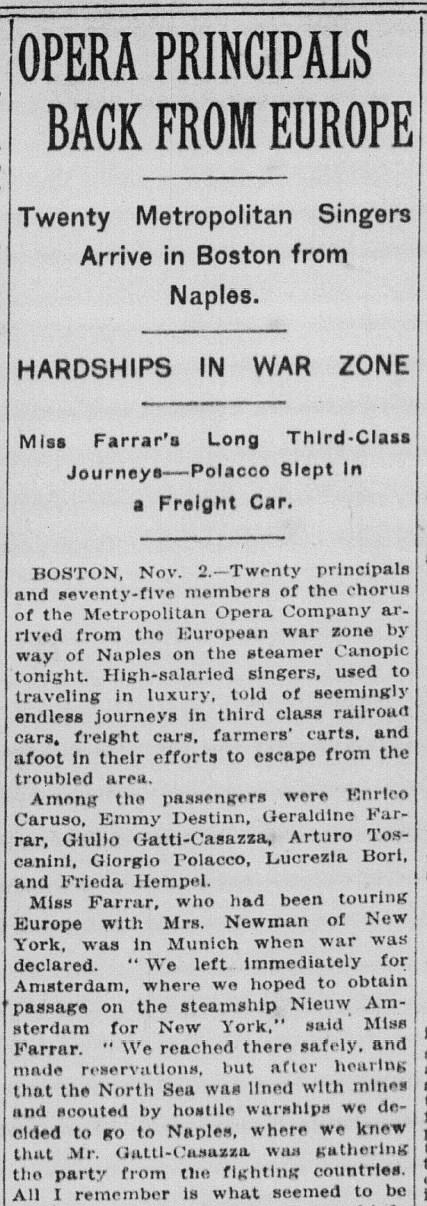 オペラ・スターといえども、第一次大戦開戦後数か月の時期、